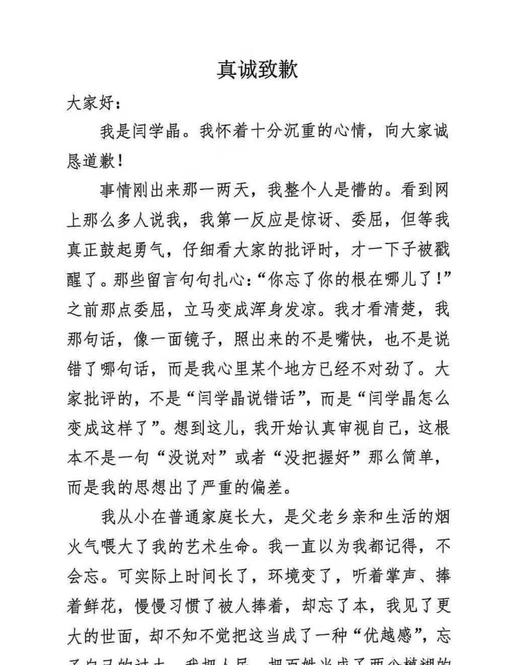 更惨的是,原本她有机会上今年的辽宁春晚,这事儿一出,节目组直接把她的节目撤了。眼看着赚钱的路被断,事业要黄,沉默了十几天的闫学晶终于慌了,写了一篇两页纸的道歉信,写得那叫一个惨,她儿子也跟着发文:“我妈犯的错,我来担!”