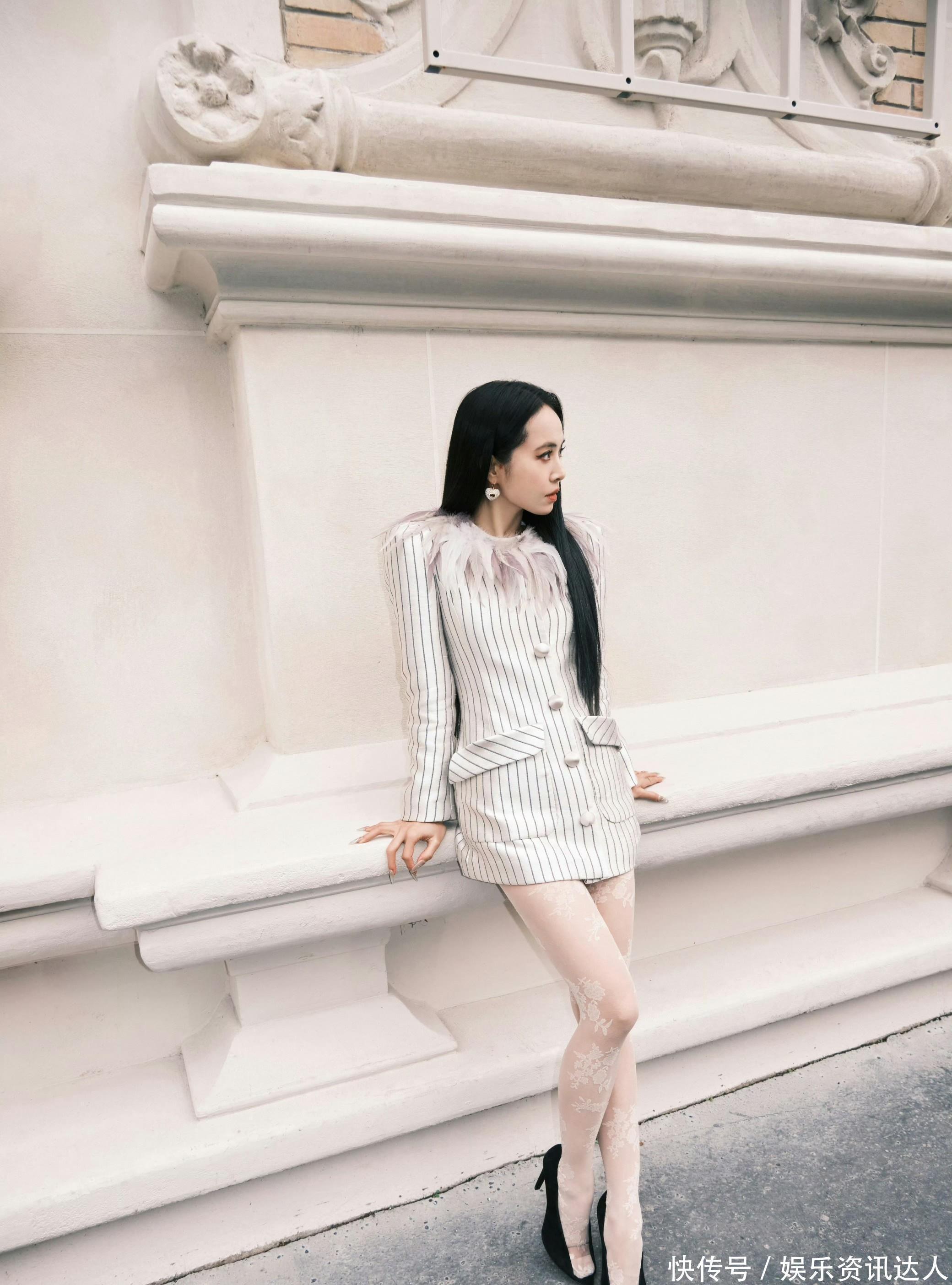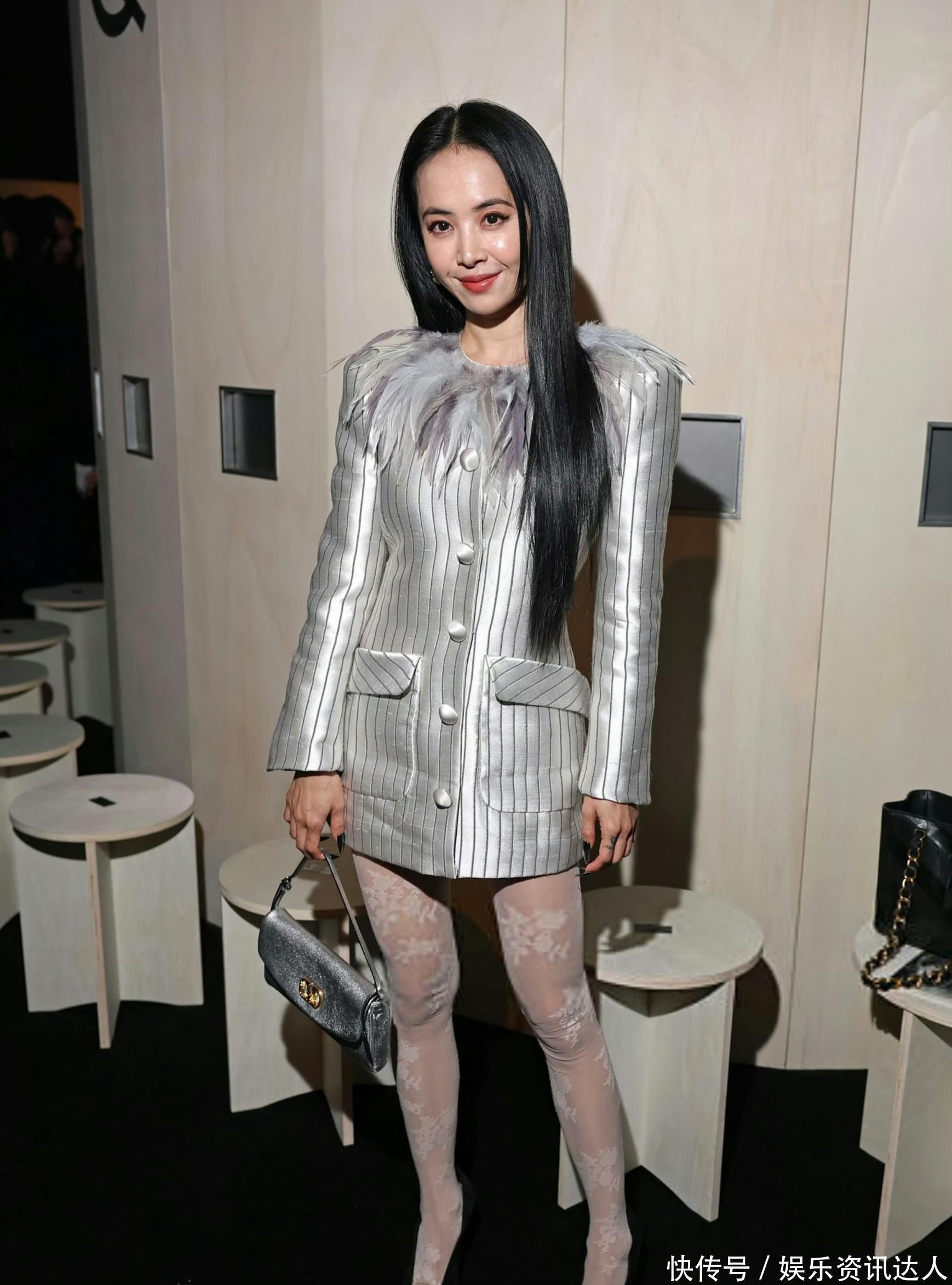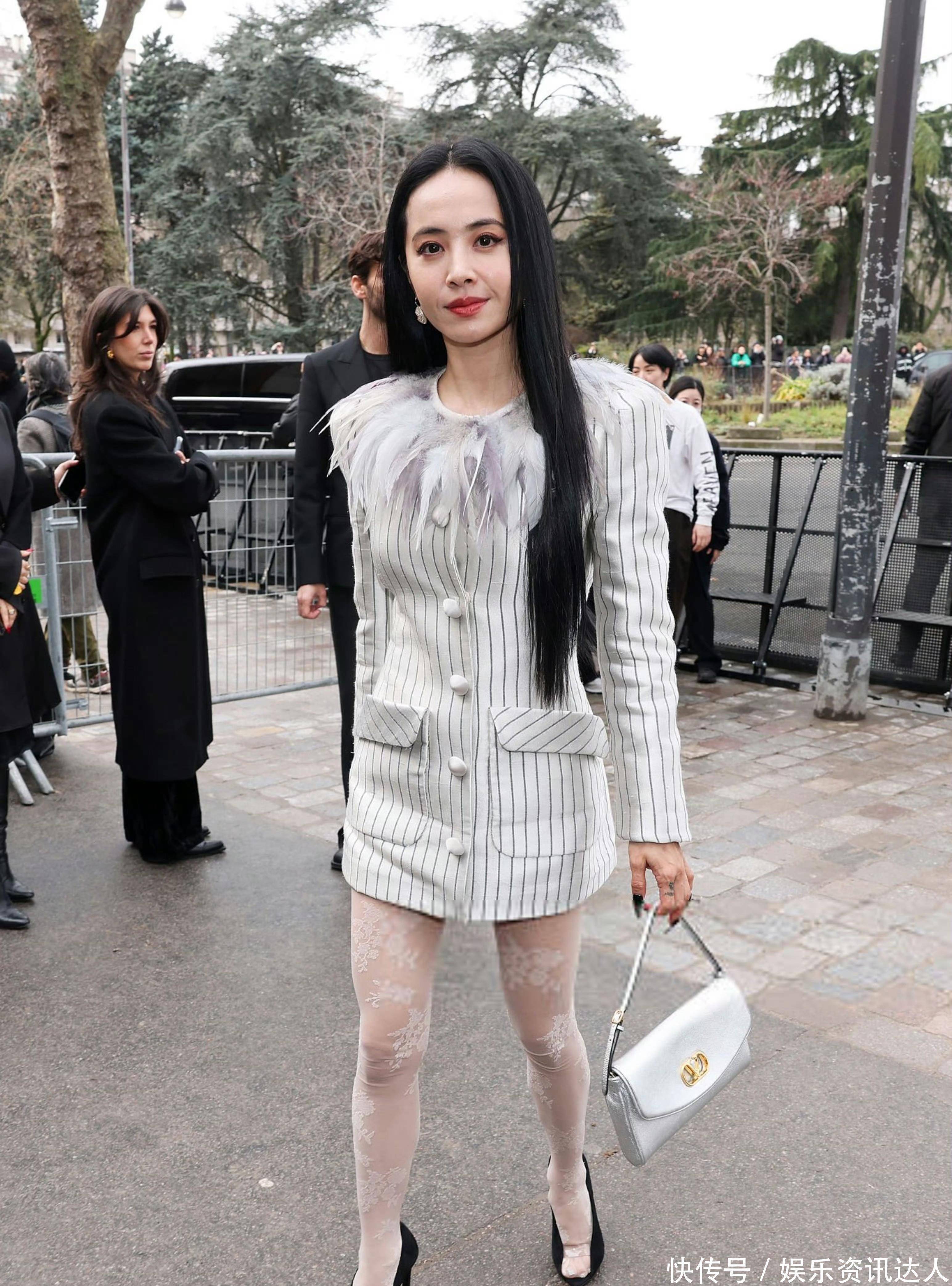 她身上这件浅灰底细条纹西装裙,把“甜酷平衡”四个字焊在了身上。版型是利落的H型,长度刚好卡在大腿中部,自带法式随性的松弛感。最妙的是领口那圈渐变灰羽毛,软乎乎的质感中和了西装的硬朗,走路时羽毛随着步伐轻晃,把清冷感拉满。