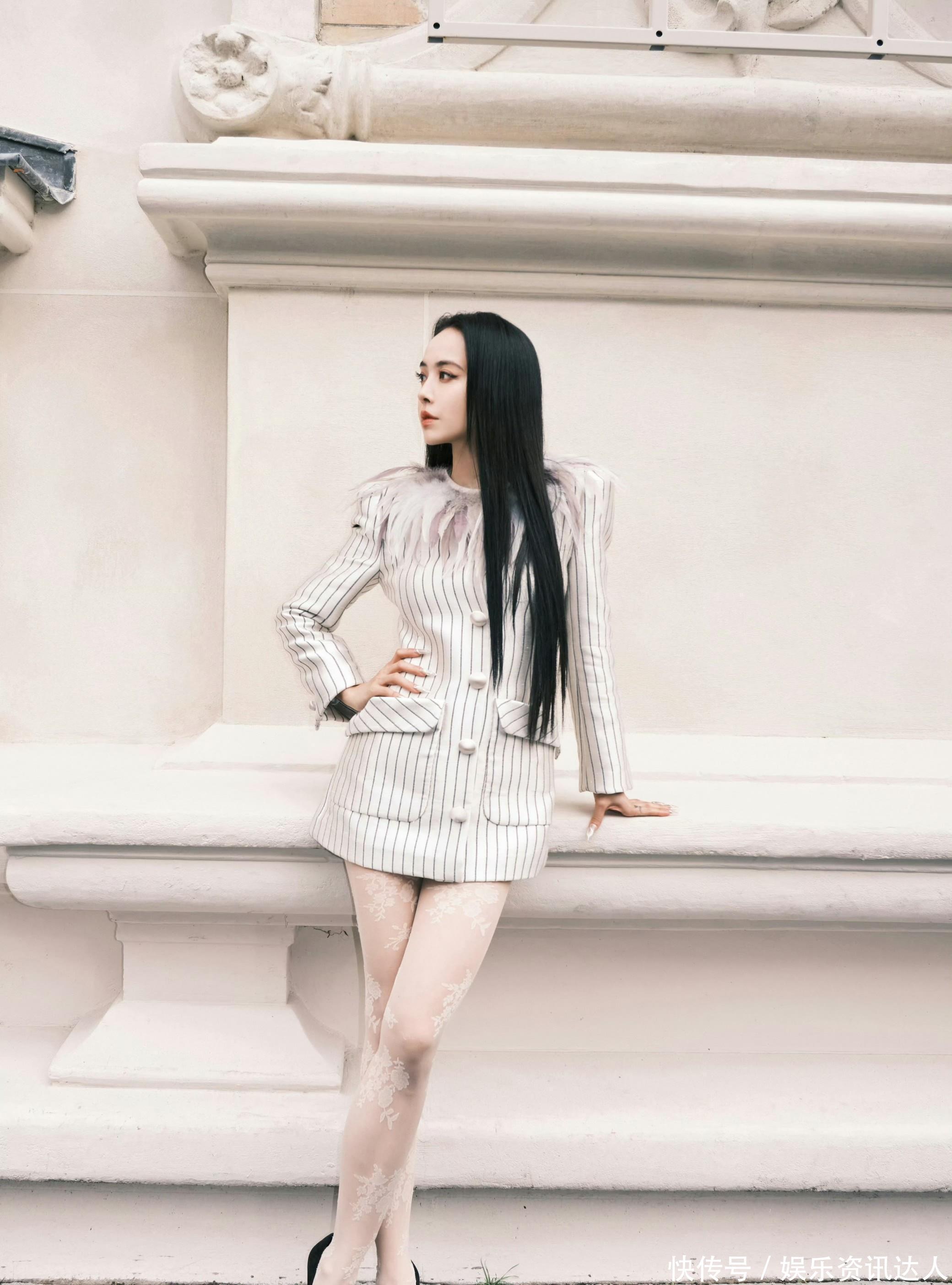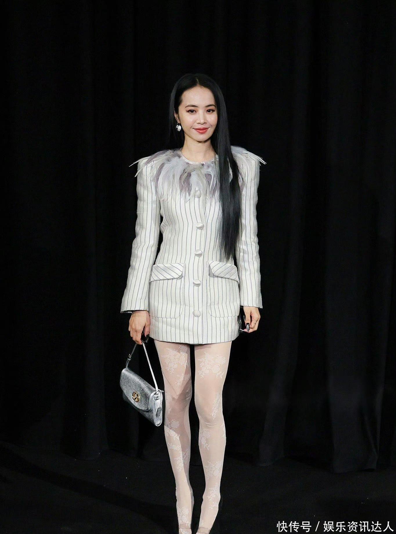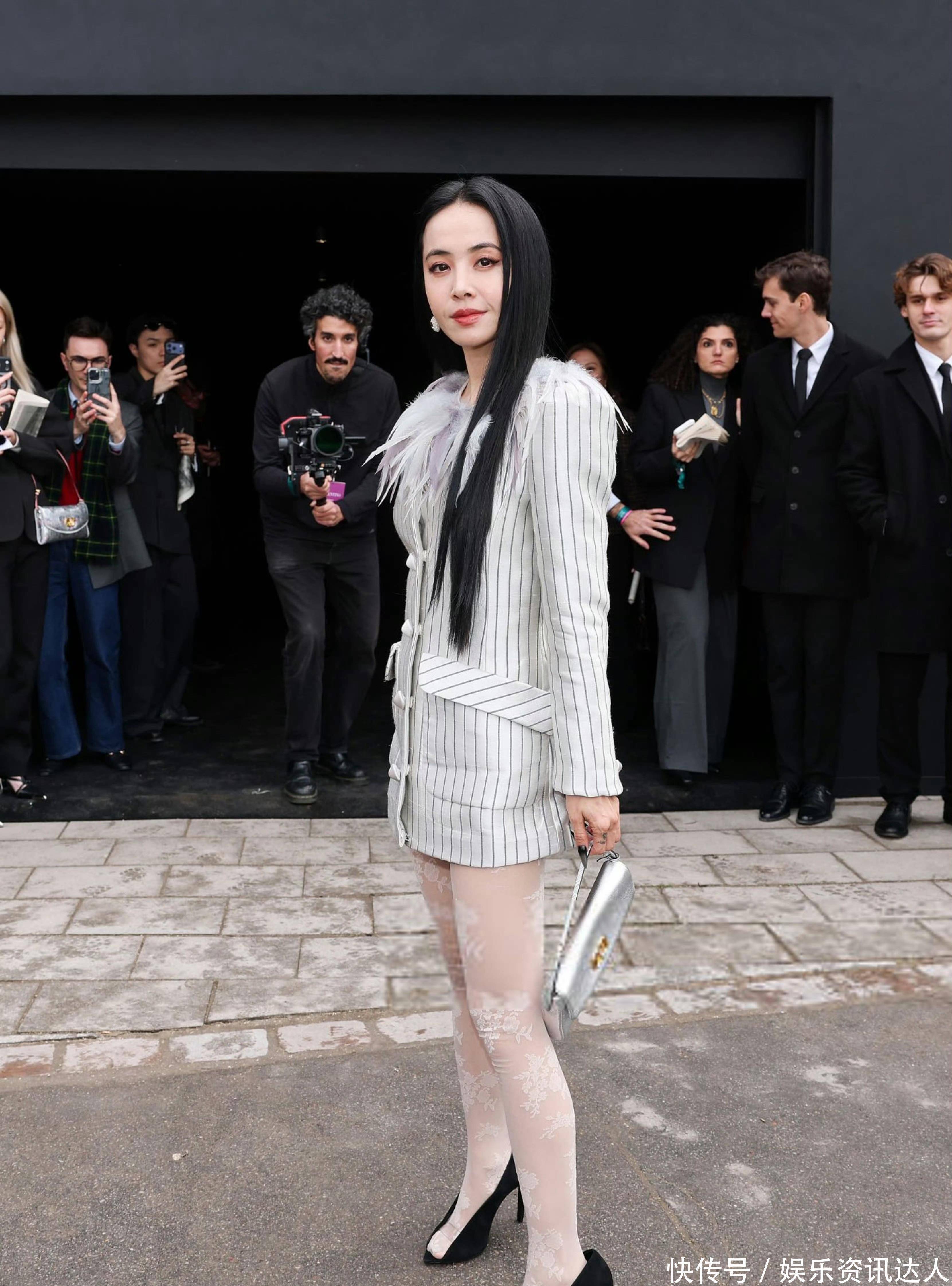 她身上这件浅灰底细条纹西装裙,把“甜酷平衡”四个字焊在了身上。版型是利落的H型,长度刚好卡在大腿中部,自带法式随性的松弛感。最妙的是领口那圈渐变灰羽毛,软乎乎的质感中和了西装的硬朗,走路时羽毛随着步伐轻晃,把清冷感拉满。
