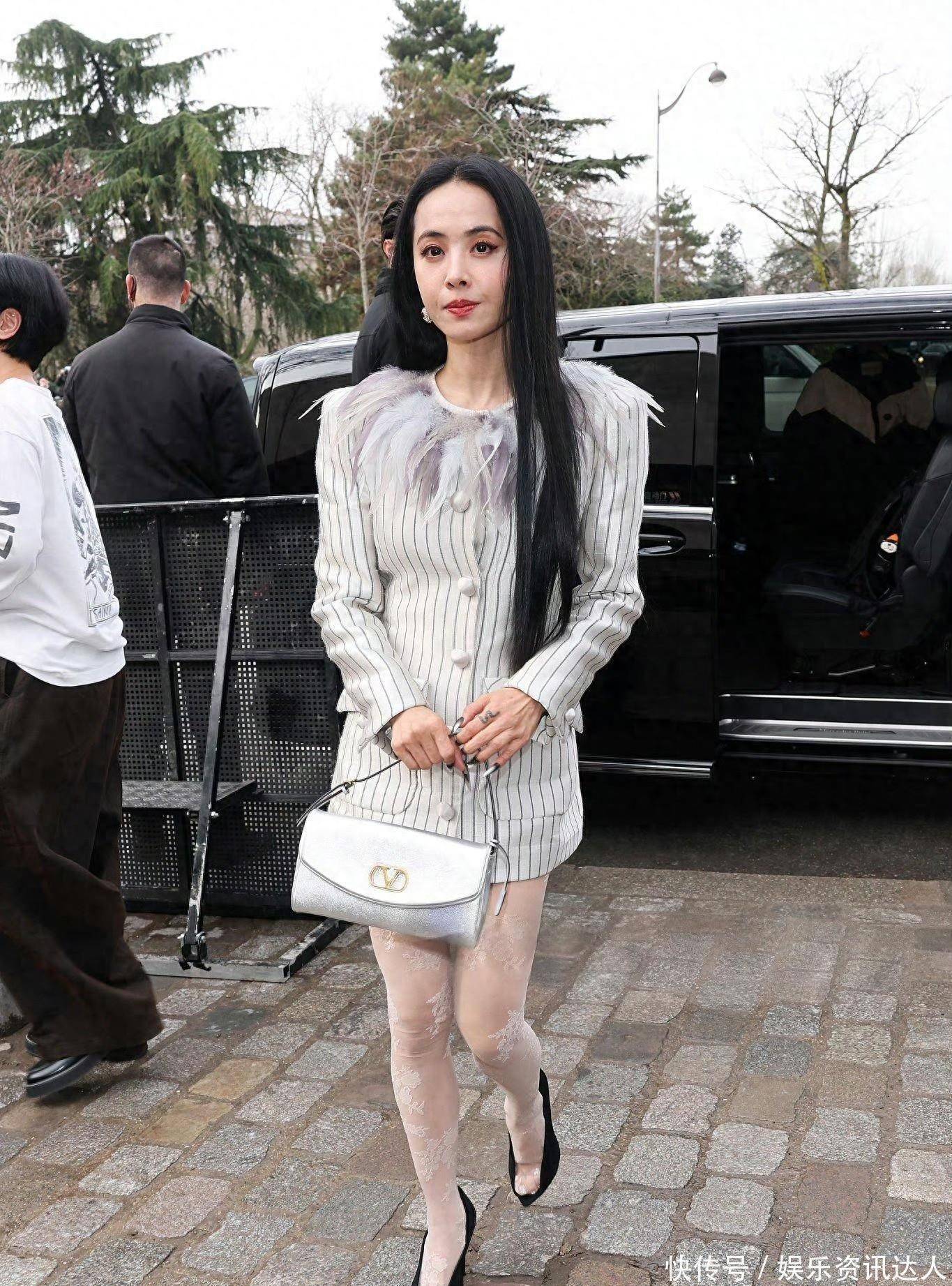 她的配饰也选得很聪明。Valentino的闪钻腋下包,银色碎钻在灯光下低调发光,和羽毛的光泽感形成呼应。耳饰只用了一颗小珍珠,没有多余的点缀,把焦点牢牢锁在衣服本身。这种“少即是多”的搭配思路,才是真正的高手。