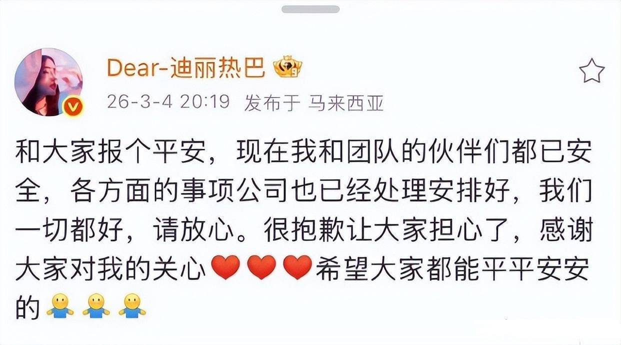 顶流女神迪丽热巴发文报平安,其IP地址显示为马来西亚,体面回应显格局!
