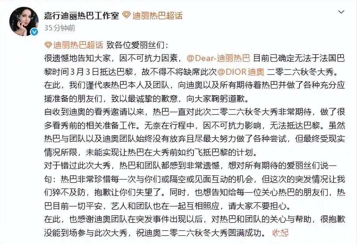 咱们先来捋捋这事儿到底有多悬。就在前两天,据网友爆料,迪丽热巴作为某国际顶奢大牌的全球代言人,本来是要去巴黎时装周美美亮相、大杀四方的。为了这场秀,据说团队筹备了好几个月,就等着她在秀场上给咱们内娱长长脸。结果呢?计划赶不上变化,中东那旮旯局势突然就升级了,阿联酋那边儿说关领空就关领空,迪拜国际机场瞬间就瘫痪了,成千上万的人滞留在那儿,哭都找不到调儿。