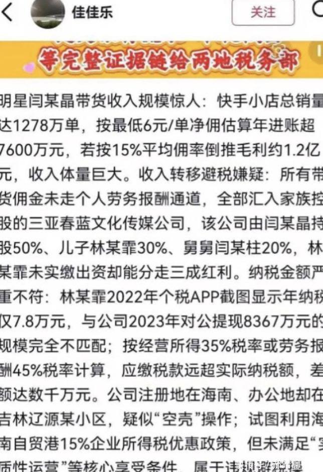 闫学晶在快手小店里的总销量已经突破万单,按推算,毛利润大约.2亿左右。这么大的收入规模,让人不免怀疑是不是有转移和避税的嫌疑。还有网友指出,所有的带货佣金都没有通过个人劳务报酬的渠道来走,而是全部打入了家族控制的三亚春蓝文化传媒公司。